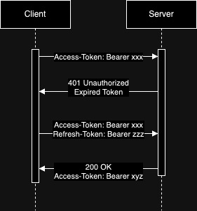 - Server → Client: ํ ํฐ์ด ๋ง๋ฃ๋์์ ๊ฒฝ์ฐ, ์ํ์ฝ๋์ ํจ๊ป Expired ๋ฉ์ธ์ง๋ฅผ ์๋ต