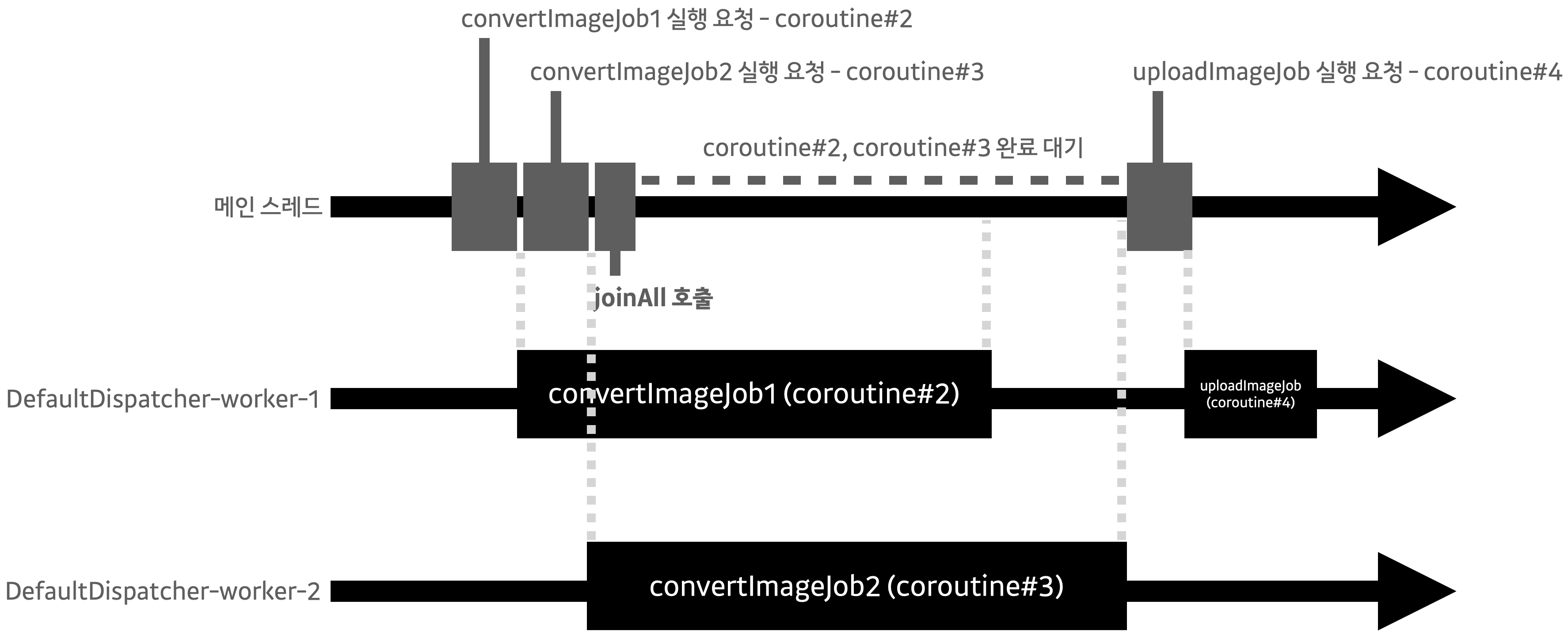 - `joinAll()`ํธ์ถ → Job1, Job2๊ฐ ์คํ ์๋ฃ๋ ๋๊น์ง ์ผ์ ์ค๋จ