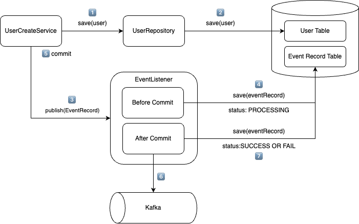 - EventRecord ์ ์ฅ: `UserCreateService`์ `create` ํธ๋์ญ์ ์ด ์ปค๋ฐ๋๊ธฐ ์ง์ Database์ Record ์ ๋ณด๋ฅผ ์ ์ฅํ๋ค.