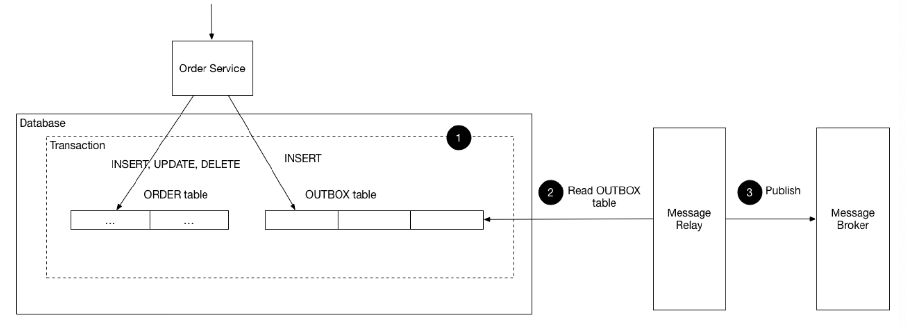 - Database: ๋๋ฉ์ธ ์ํฐํฐ์ ๋ฉ์ธ์ง Outbox๋ฅผ ์ ์ฅ