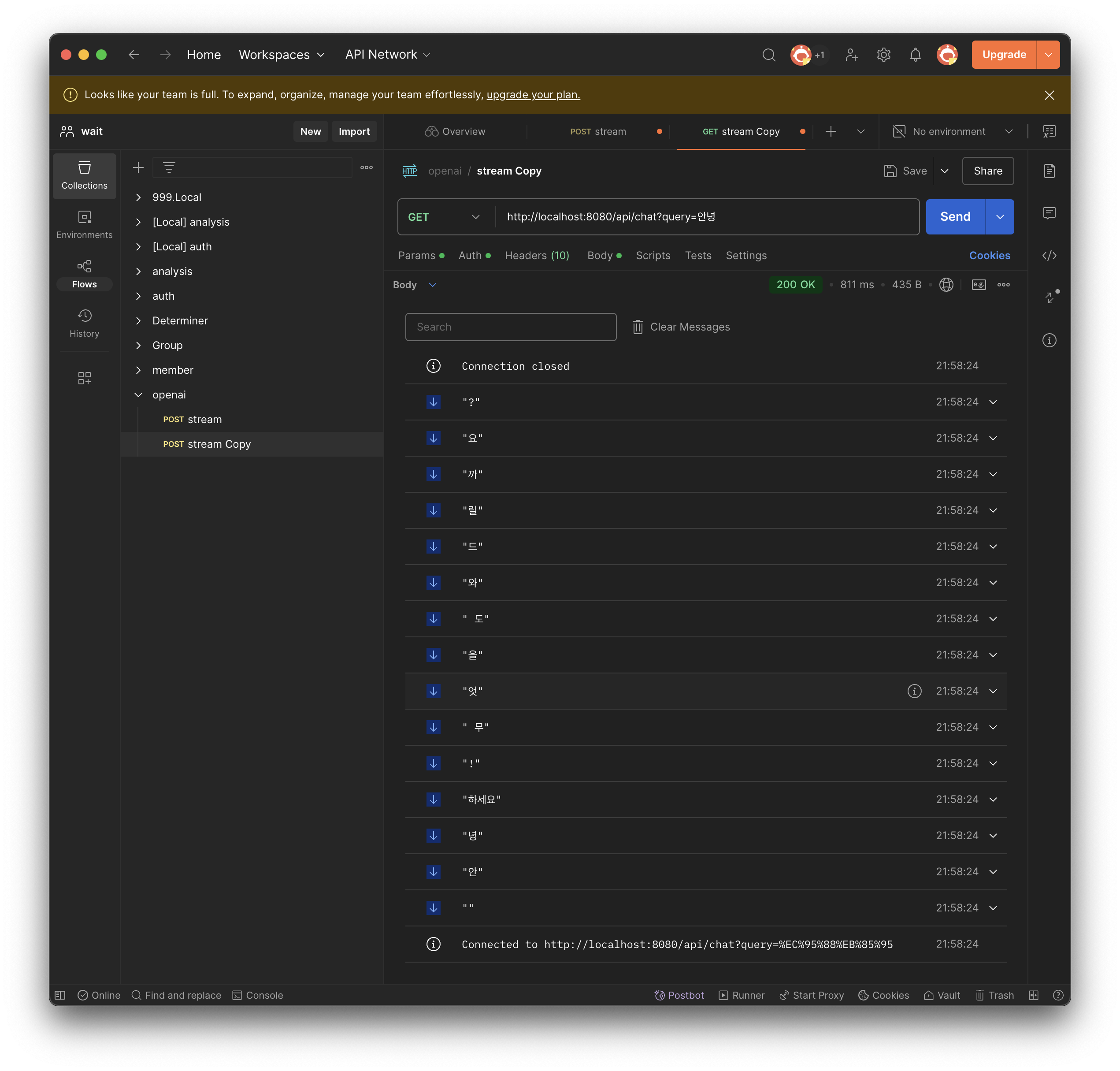 ํด๋น API๋ก ์์ฒญ์ ๋ณด๋ด๋ฉด, SSE ์๋ต์ผ๋ก OpenAI๋ก ๋ฐ์ ์๋ต ํ๊ธ์์ฉ์ Client๋ก ๋ด๋ ค์ฃผ๋ ๊ฒ์ ๋ณผ ์ ์๋ค.