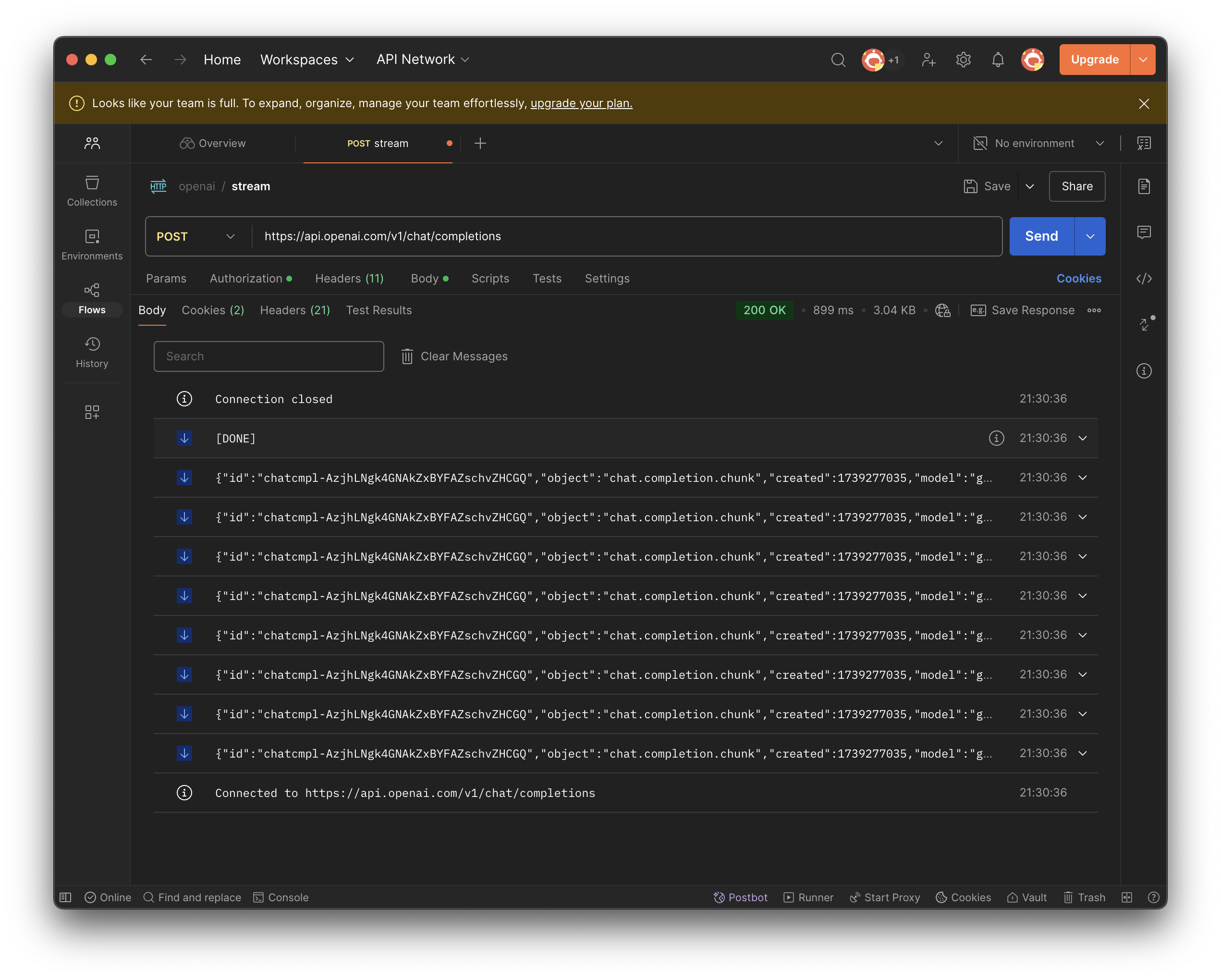 Chat ์๋ต์ ์ผ์ ํ Json ํฌ๋งท์ผ๋ก ๋ด๋ ค์ค์ง๋ง, ์๋ต์ด ์ข ๋ฃ๋์์ ๊ฒฝ์ฐ “[DONE]” ํ ์คํธ๋ก ๋ด๋ ค์ค๋ ๊ฒ์ ๋ณผ ์ ์๋ค. (docs์๋ ๋ช ์๋์ด์์)