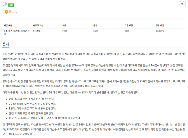 โพ๋ 9๋ช ์ผ๋ก ์ด๋ฃจ์ด์ง ๋ ํ์ด ๊ณต๊ฒฉ๊ณผ ์๋น๋ฅผ ๋ฒ๊ฐ์ ํ๋ ๊ฒ์์ด๋ค. ํ๋์ ์ด๋์ ๊ณต๊ฒฉ๊ณผ ์๋น๋ก ์ด๋ฃจ์ด์ ธ ์๊ณ , ์ด N์ด๋ ๋์ ๊ฒ์์ ์งํํด์ผ ํ๋ค. ํ ์ด๋์ 3์์์ด ๋ฐ์ํ๋ฉด ์ด๋์ด ์ข