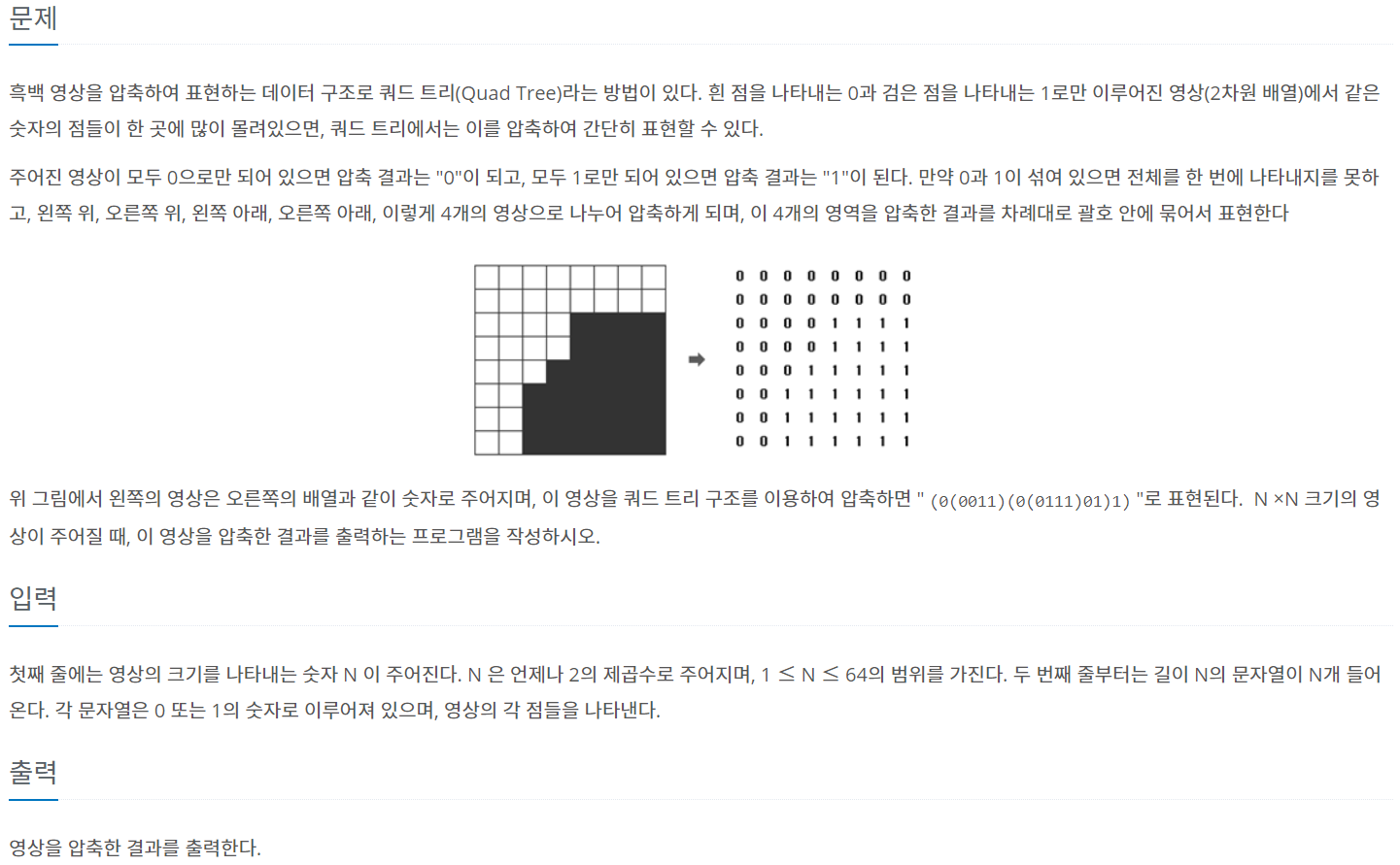 ์ฒซ์งธ ์ค์๋ ์์์ ํฌ๊ธฐ๋ฅผ ๋ํ๋ด๋ ์ซ์ N ์ด ์ฃผ์ด์ง๋ค. N ์ ์ธ์ ๋ 2์ ์ ๊ณฑ์๋ก ์ฃผ์ด์ง๋ฉฐ, 1 ≤ N ≤ 64์ ๋ฒ์๋ฅผ ๊ฐ์ง๋ค. ๋ ๋ฒ์งธ ์ค๋ถํฐ๋ ๊ธธ์ด N์ ๋ฌธ์์ด์ด N๊ฐ ๋ค์ด์จ๋ค. ๊ฐ ๋ฌธ์์ด์ 0 ๋