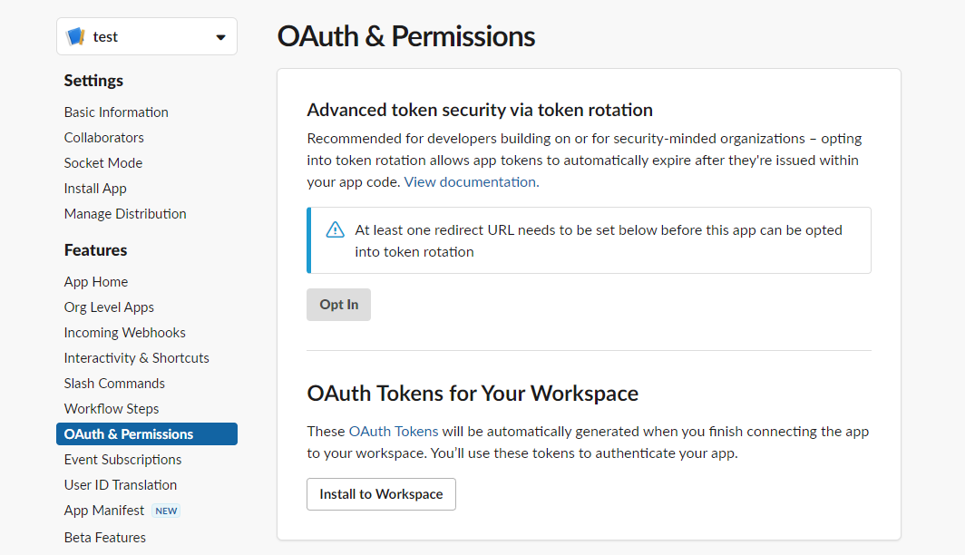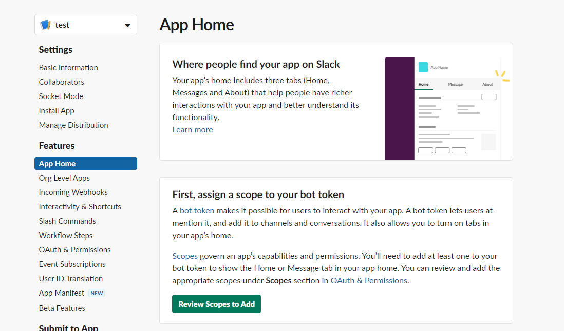 - workspace๊ฐ ์์ผ๋ฉด app ์์ฑ ๋ถ๊ฐ! → ์ฌ๋ฌ workspace์์ ์ฌ์ฉํ๋ bot๊ฐ๋ฐ ์, ์์ฑ ํ distribution ์ค์ ํด์ผ ํจ