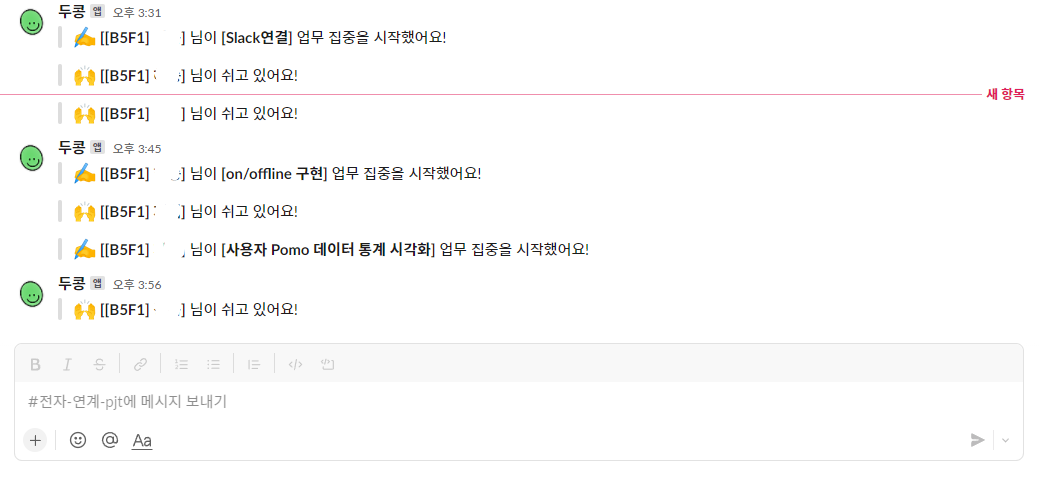 - ๊ทธ๋ฃน์ด ์ฌ๋๊ณผ ์ฐ๋ํ ๊ฒฝ์ฐ, ๊ทธ๋ฃน ์๋ค์ ์ํ๊ฐ Slack Bot์ ํตํด ํ์๋๋ค!