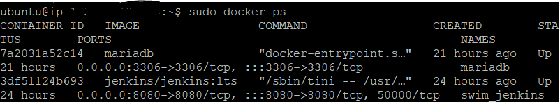 - -v: ํธ์คํธ์ ํ์ผ ์์คํ ๊ณผ ๋์ปค ์ปจํ ์ด๋ ํ์ผ์์คํ ์ฐ๊ฒฐ (/app/swim ๋๋ ํ ๋ฆฌ์ /var/jenkins_home์ ๋ง์ดํธ)