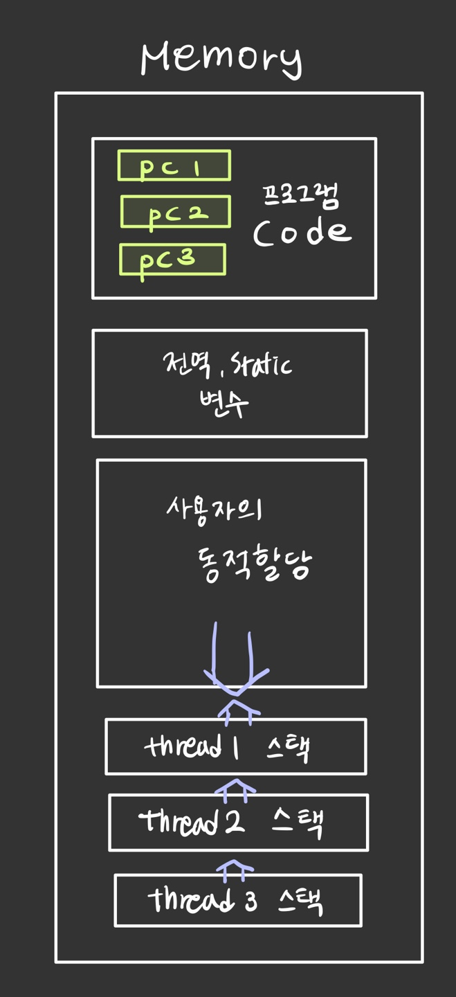 - thread๋ ์ ๋ ๋ฆฝ์ ์ธ stack memory ์์ญ์ด ํ์ํ๊ฐ.