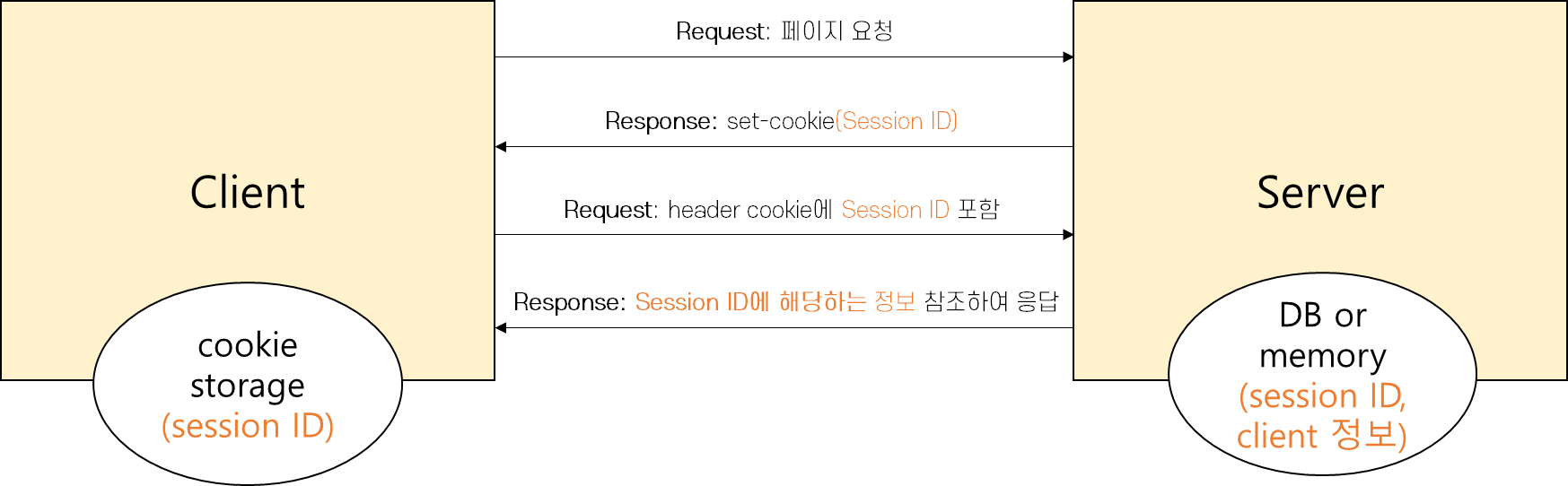 - ํด๋ผ์ด์ธํธ๋ฅผ ๊ตฌ๋ถํ๊ธฐ ์ํด ๊ฐ ํด๋ผ์ด์ธํธ์๊ฒ sessionID๋ฅผ ๋ถ์ฌํ๊ณ ํด๋ผ์ด์ธํธ๋ ์ฟ ํค์ session ID๋ฅผ ์ ์ฅ