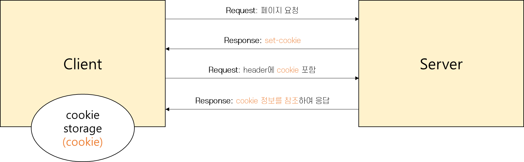 - ์๋ฒ์์ response header์ set-cookie ์์ฑ์ ์ฌ์ฉํ์ฌ ํด๋ผ์ด์ธํธ์ ์ฟ ํค๋ฅผ ๋ง๋ค๊ณ , ์ฌ์ฉ์๊ฐ ๋ฐ๋ก ์์ ํ์ง ์์๋ ๋ธ๋ผ์ฐ์ ๊ฐ request header์ ๋ด์์ ์๋ฒ์ ์ ์ก
